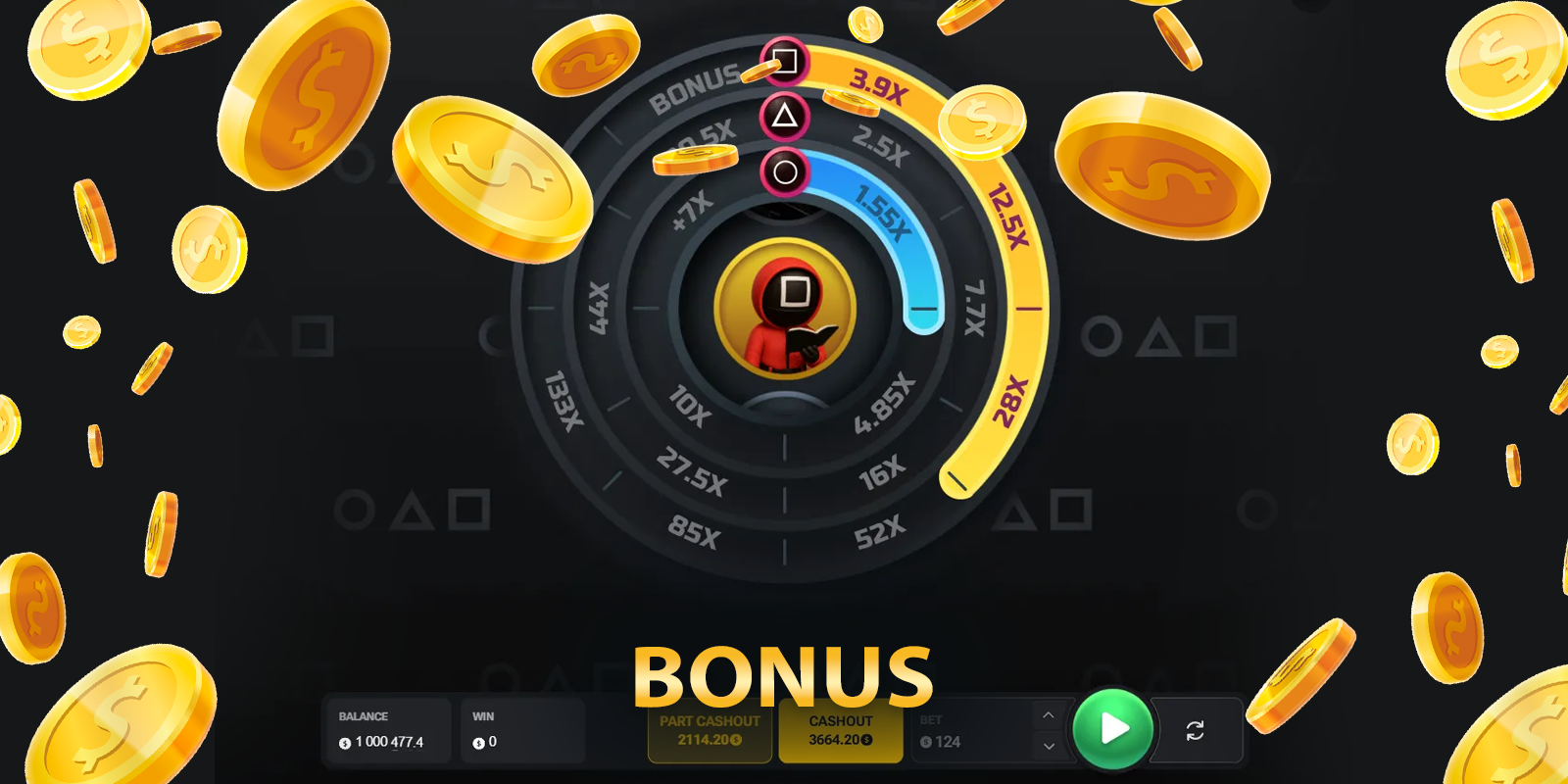RTP (96%): This percentage, while a touch below the average for classic slots, is customary for the crash genre. In games like Squid Gamebler, where player decisions directly shape the result, the marginally lower RTP is counterbalanced by the enhanced strategic control. Skillful application of the Part Cashout can positively affect your personal session return.